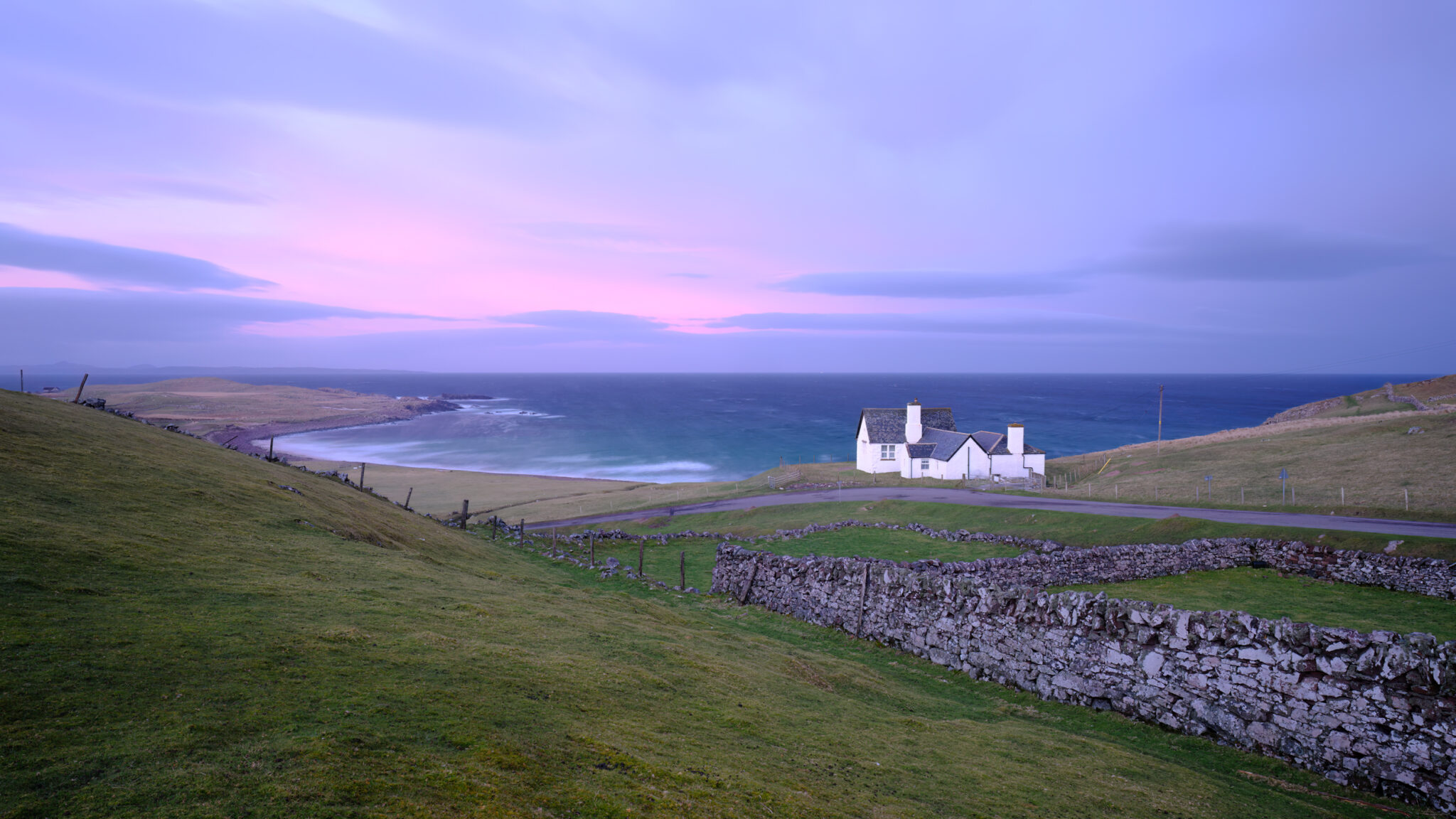 Set in the remote Highlands of Scotland, this photograph captures an idyllic coastal scene at first light. A white cottage sits quietly above a sweeping bay, overlooking soft sands and the vast Atlantic beyond.