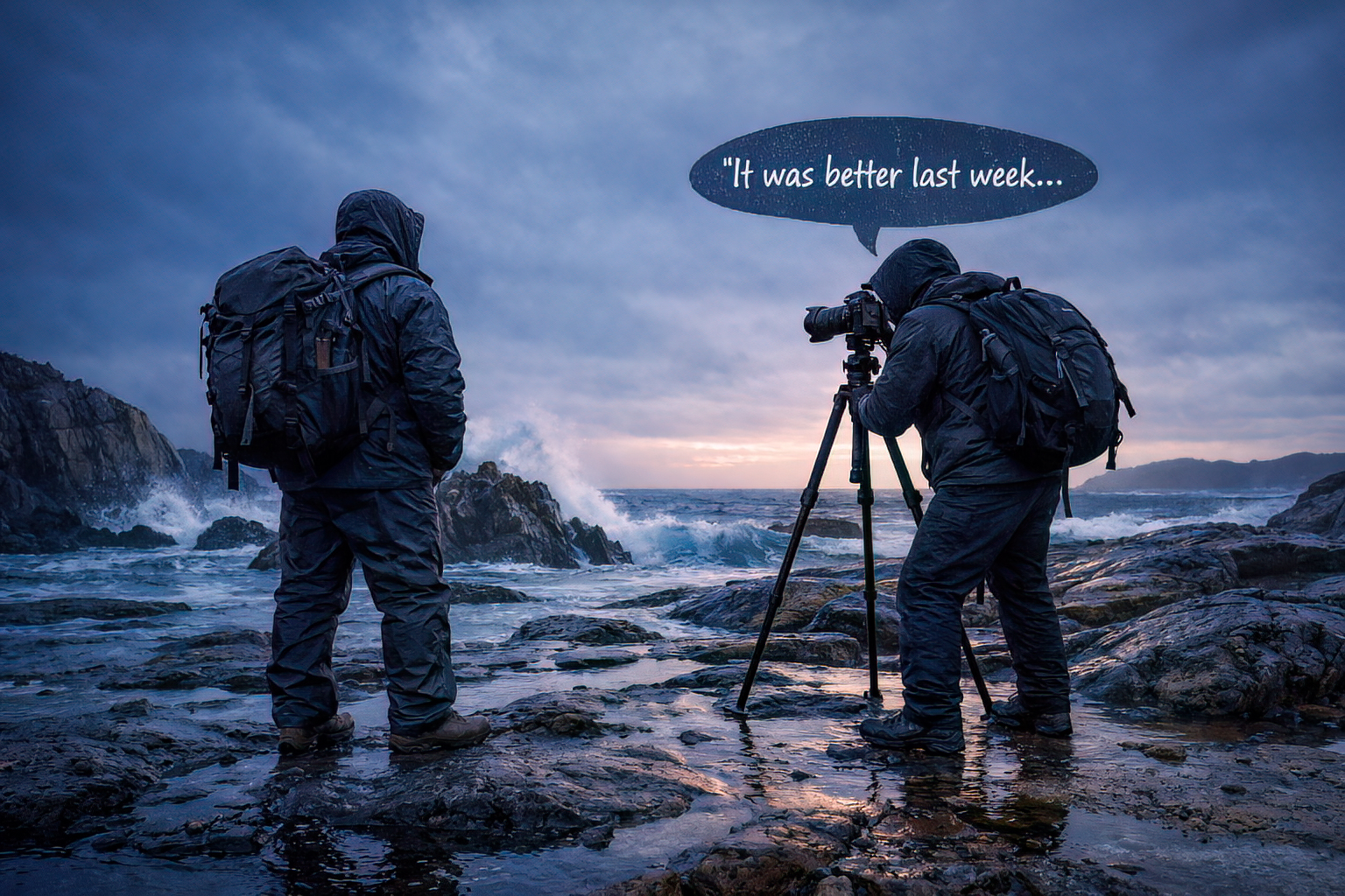 Last week. The golden age. The mythical moment when everything aligned. Last week there was snow. Or mist. Or massive waves. Or the kind of sky that makes strangers gasp. Last week was perfect.